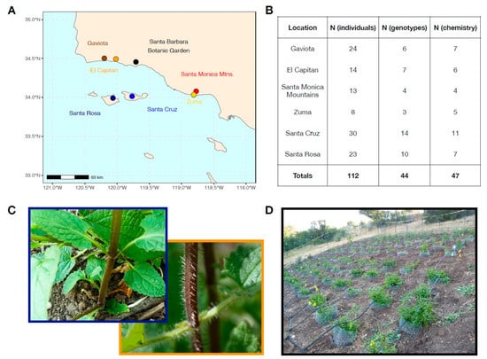 Stachys bullata (Lamiaceae) is a perennial herbaceous plant that occurs in coastal California from approximately Orange County to the San Francisco Bay Area, with populations present on Santa Cruz, Santa Rosa, and Anacapa Islands. It reproduces both clonally via rhizomes and sexually and is described as being glandular, with aromatic foliage that is characteristic of many plants in the Lamiaceae. However, island populations have been noted to have non-aromatic foliage as well as larger leaves and flowers than their mainland relatives [34], and densities of glandular trichomes appear to be much lower on island plants (Figure 2C).