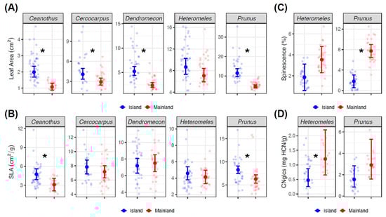 Trait values for each species across island and mainland locations, based on field sampling. Model-estimated marginal means and 95% confidence intervals are shown with solid points and lines. Each pale dot corresponds to a single plant-level mean, which is itself the mean of leaf traits from branches in the upper and lower canopy. Measured leaf traits were (A) leaf area, (B) specific leaf area, (C) marginal leaf spinescence (Heteromeles and Prunus only), and (D) concentrations of cyanogenic glycosides (Heteromeles and Prunus only). Asterisks correspond to significant (p < 0.05) differences between island and mainland plants within each species x trait combination.
