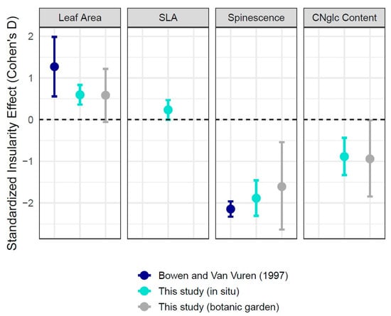 Although we did not directly assess the efficacy of putative leaf defenses against herbivores, two studies using plants from the Channel Islands have shown that mammalian herbivores perceive differences between island and mainland plants. Bowen and Van Vuren (1997) [14] showed that sheep preferentially consumed leaf tissue from plants collected on Santa Cruz Island compared to a mainland location, and Salladay and Ramírez (2018) [33] likewise showed the same pattern with goats and plant tissue from Santa Catalina Island. Thus, the reductions in spinescence and CNglcs that we measured (or potentially other correlated traits) seem to be reasonable proxies for increased palatability to mammalian herbivores. Because we sampled the same taxa as Bowen and Van Vuren [14] (and at the same time of year), we can directly compare our data on leaf area and marginal spines from Santa Cruz Island to theirs. Insularity effects are in the same direction (Figure 4), although the magnitude of island/mainland differences reported in Bowen and Van Vuren is larger.