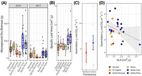 (A) Aboveground biomass across 2016 and 2017 for S. bullata populations grown at the SBBG common garden. (B) Specific leaf area for the same populations in 2017. (C) Net carbon assimilation (Anet) measured for a subset of 26 S. bullata plants and separated based on provenance (island versus mainland). Island plants had marginally higher rates of Anet. (D) Carbon assimilation and specific leaf area were significantly negatively correlated across the 26 sampled plants.