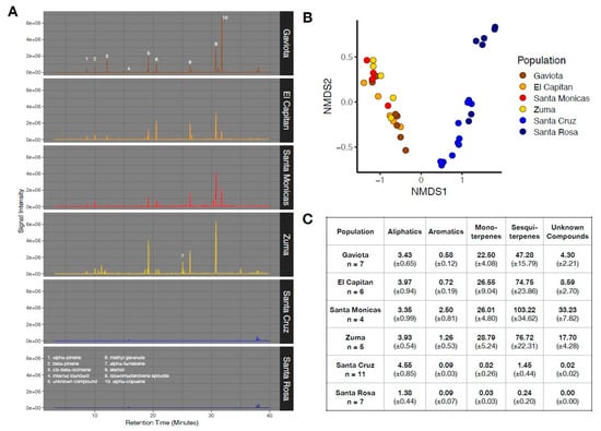 (A) Representative chromatograms for S. bullata from each of the six collection locations. Tentative identity of numbered peaks is shown in the bottom panel. (B) NMDS plot with samples grouped based on collection location. (C) Average concentration (in tetralin equivalents) for major compound classes detected in samples. Values represent mean ± standard errors.