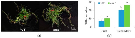 Comparison of the tillering phenotype between the mtn1 mutant (right) and WT (left) in 60-day-old plants (a); the first and secondary tiller numbers of mtn1 mutant and WT (b). Data are shown as mean ± standard error. Different lowercases indicate significant differences determined by Student–Newman–Keuls tests (p < 0.05).
