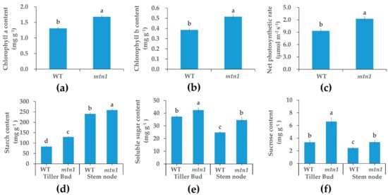 The results showed that the mtn1 mutant accumulated higher levels of chlorophyll a and chlorophyll b contents compared to the WT (Figure 2a,b). The levels increased by 29.09% and 33.68%, respectively. The net photosynthetic rate of the mtn1 mutant increased by 31.44% compared to the WT, consistent with the chlorophyll contents (Figure 2c). Additionally, the tiller bud and stem node of the mtn1 mutant accumulated higher levels of starch, soluble sugar, and sucrose compared to the WT (Figure 2d–f). Starch levels increased by 13.79% and 39.10% in the tiller bud and stem node, respectively. Soluble sugar levels increased by 97.64% and 37.97% in the tiller bud and stem node, respectively. Sucrose levels increased by 55.64% in the tiller bud and 7.68% in the stem node.