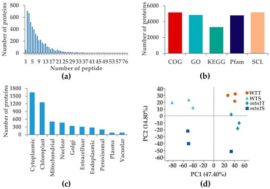 Overview of the proteome data. (a) Peptide distribution in identified proteins, with the horizontal axis representing the range of peptides covering each protein, and the vertical axis representing the count. (b) Protein annotation results, including Clusters of Orthologous Groups (COGs), Gene Ontology (GO), Kyoto Encyclopedia of Genes and Genomes (KEGGs), protein family database (Pfm), and subcellular location (SCL). (c) Prediction of subcellular localization in identified proteins. (d) Principal component analysis (PCA); WTT: WT tiller bud, WTS: WT stem node, mtn1T: mtn1 tiller bud, mtn1S: mtn1 stem node.