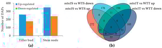 In the tiller buds of the mtn1 mutant, a total of 438 DAPs were identified, including 260 up-regulated proteins and 178 down-regulated proteins, when compared to WT (Figure 4a). In the stem node of the mtn1 mutant, 589 DAPs were identified, including 349 up-regulated proteins and 240 down-regulated proteins, compared to the WT (Figure 4a). In the tiller buds, 194 proteins were specifically up-regulated and 103 proteins were specifically down-regulated, whereas in the stem node, 272 proteins were specifically up-regulated and 178 were specifically down-regulated (Figure 4b).