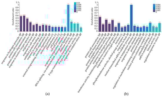 GO analysis of the functional classification of DAPs in in tiller buds (a) and stem nodes (b). The color bars represent the significance of GO enrichment. The darker the default color, the more significant the enrichment of the GO pathway. Markers with a significance level of p < 0.001 are represented by ***, p < 0.01 are represented by **, and p < 0.05 are represented by *. p ≤ 0.05 was considered indicative of significant enrichment in GO function.