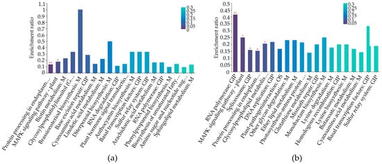 The results of KEGG pathway enrichment analysis results revealed that the DAPs in the tiller buds of the mtn1 mutant were primarily involved in endoplasmic reticulum protein processing, ribosome, glycine, serine, and threonine metabolism, oxidative phosphorylation, and the MAPK signaling pathway (Figure 6a). The DAPs in the stem node of the mtn1 mutant were mainly associated with RNA polymerase, MAPK signaling pathway, glycerophospholipid metabolism, and photosynthetic carbon fixation (Figure 6b). The tiller buds and stem nodes exhibited a significant enrichment of proteins involved in metabolic pathways, including plant hormone signal transduction and starch and sucrose metabolism. This suggests that these pathways may play important roles in tiller development in centipedegrass.