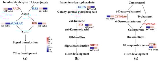 GAs are crucial plant hormones that regulate a series of activities during plant development [,,,,,]. KEGG analyses further demonstrated a significant enrichment of gibberellin (GA) synthesis and signal transduction with DAPs in the tiller bud and stem node of the mtn1 mutant (Figure 7, Supplementary Materials Table S2). Interestingly, GGPS was down-regulated, and the gibberellin receptor GID1L2 exhibited significant accumulation in mtn1 mutant (Figure 7, Supplementary Materials Table S2). Our study confirmed the findings of previous studies conducted on orchardgrass, indicating a decrease in the expression levels of DgCPS and DgGA2ox, which are associated with GA synthesis, in multi-tillering cultivars []. Similar findings were observed in rice, where overexpression of OsGID1 led to a decrease in tiller numbers []. GGPS catalyzes the synthesis of GGPP from farnesyl diphosphate and isopentenyl diphosphate []. This result implies that the biosynthesis of GAs was decreased in the mtn1 mutant compared to the wild type. We inferred that the mtn1 mutant may accumulate fewer GAs compared to GGPS, which could account for the differences in tillering ability between the mtn1 mutant and WT.