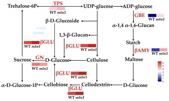 DAPs involved in starch and sucrose metabolism were detected in both the tiller buds and stem nodes of the mtn1 mutant. We identified a total of four DAPs in the tiller buds and stem nodes, with two being up-regulated and two being down-regulated. Additionally, six up-regulated DAPs were found in the tiller buds, while the stem nodes exhibited six up-regulated DAPs (Supplementary Materials Table S3 and Figure 8). Tiller buds showed up-regulation of β-glucosidase (GLU) and 1,4-α-glucan-branching enzyme (GBE), while down-regulation was observed for the glycosyl hydrolase family 9 (GH9) and β-amylase (βAMY). Conversely, the stem nodes exhibited up-regulation of βAMY, trehalose-6-phosphate synthase (TPS), endo-1,4-β-D-glucanohydrolase (EG), GBE, and GLU.