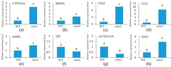 BRs are a significant class of hormones involved in regulating cell elongation and differentiation [,,,,]. Specifically, CYP92A6 and TCH4 exhibited significant accumulation in the mtn1 mutant (Figure 7). In this study, the accumulation of CYP92A6 in the mtn1 mutant may result in an increase in BR content. A similar study has shown that the overexpression of the BR biosynthesis gene OsHAP1 (Sterol C–22 hydroxylase) in rice can increase the tiller number []. TCH4 is an important target protein downstream of BR signaling and acts as a major component of the plant cell walls, playing a role in cell elongation []. We assumed that mtn1 mutant may accumulate more BRs due to the accumulation of CYP92A6, which could account for the differences in tillering ability between the mtn1 mutant and WT.
