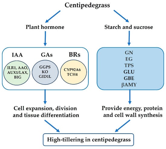 A hypothetical interaction network between auxin, gibberellins (GAs), brassinosteroids (BRs) and sugars is proposed to regulate high tillering in the mtn1 mutant in centipedegrass.