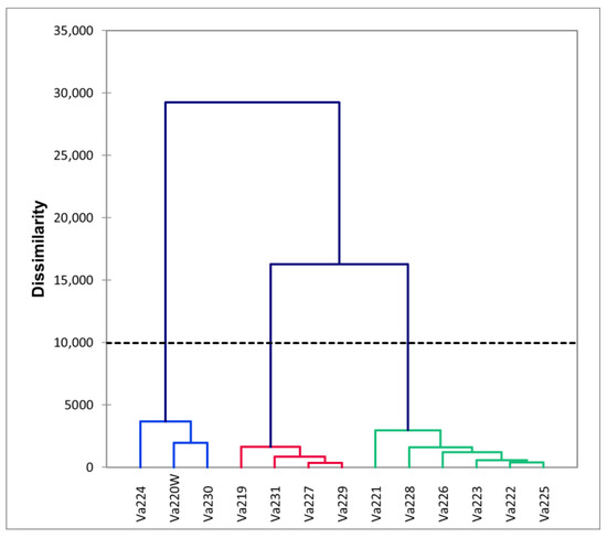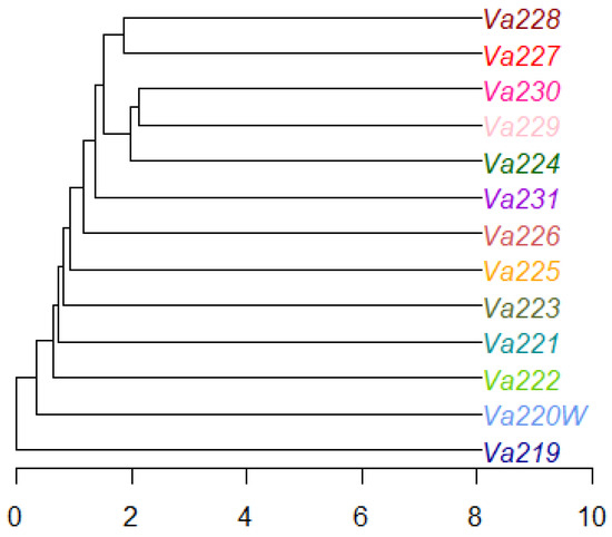 Structure analysis, at K = 6, revealed an alternative level of population structure (Figure 5B and Table S4). As observed for K = 4, Va219 and Va221 clustered separately, and Va227 and Va228 clustered together. At K = 6, Va225 and Va231 were assigned to two clusters, while Va222 and Va226 became admixed. Va223, Va224, Va229, and Va230 were still considered admixed populations.