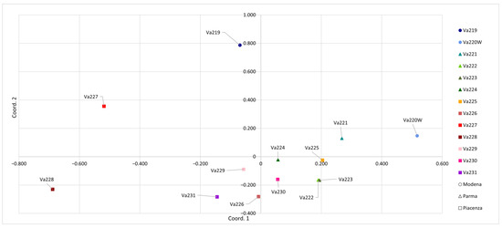When PCoA was carried out considering a genetic distance matrix between populations, the separation among accessions became clearer (Figure 3). The first principal coordinate accounted for 22.47% of the total genetic variation and better separated accessions previously clustered together, whereas the second principal coordinate accounted for 19.83% of the total variation. This allowed the good separation of Va219, Va220W, Va227, and Va228 from the other accessions. Moreover, PCoA of populations allowed a better separation between provinces, where two accessions from Modena (Va219 and Va220W) were well separated from the others, while four from Parma (Va221, Va222, Va223, and Va224) clustered together. Va222 and Va223 from Parma overlapped. This result was not expected, since they have different names and were cultivated and sampled in different locations: the first one in the Parma Apennines (Albareto) and the second in Salsomaggiore, in the first hills closed to the Po valley. In traditional germplasms, cases of homonymy and synonymy are particularly abundant and have been reported for maize [27] and other crops [36,37]. Va227 and Va228 were genetically distant, even if they were cultivated and sampled in the same location and classified into the same agroecotype by Brandolini and Brandolini [2,5]. This result may indicate proper maintenance of populations before sampling in 1954. It is possible that common morphological features are a case of convergent evolution or preferential selection by farmers. Findings from PCoA analysis were partially confirmed by pairwise population FST values: the highest pairwise FST values were shown between Va220W and Va228 (0.25), Va220 and Va227 (0.24), Va219 and Va228 (0.22), Va227 and Va231 (0.21), Va221 and Va228 (0.20), Va219 and Va226 (0.20), with a mean value of 0.13 (Table S2). The pairwise FST value for Va222 and Va223 (0.08) was one of the lowest and partially matched the PCoA results.