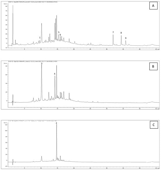 Sample chromatograms of the LEtOH extract at 280 (A), 320 (B), and 360 (C) nm. See the Table 1 for the numbers.