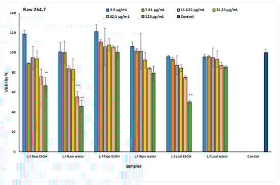 Results of L. ferocissimum extracts’ cytotoxic activities on the Raw 264.7 cell line. Values expressed as the mean ± sd (n = 3); statistical evaluations performed with the Games–Howell comparison test. Significant differences are displayed as ** p < 0.01. URFEtOH: Raw fruit 80% ethanol extract, URFW: Raw fruit water extract, RFEtOH: Ripe fruit 80% ethanol extract, RFW: Ripe fruit water extract, LEtOH: Leaf 80% ethanol extract, LW: Leaf water extract.
