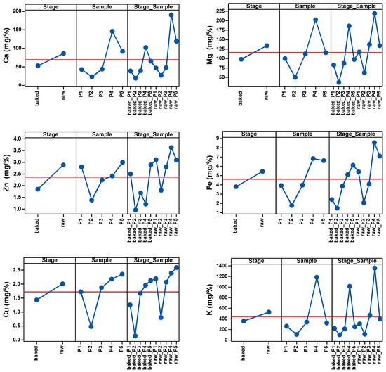 The design of experiment (DOE) aimed to compare the levels of different cations in five different cereals (P1–P5). Thus, two factors were considered: the raw factor and the baked factor. Univariated statistical analysis consisted of two-way analysis of variance (ANOVA, p = 0.05) with a post-hoc multiple pairwise sample mean comparison test, established by Dunn–Sidak, with a confidence interval of 95% (p = 0.05).
