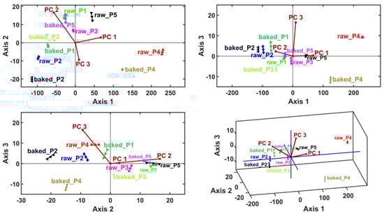 Multivariate statistical analysis considered as samples the interaction factor when raw and baked. The variables consisted of the levels of different cations in five different cereals (P1–P5).