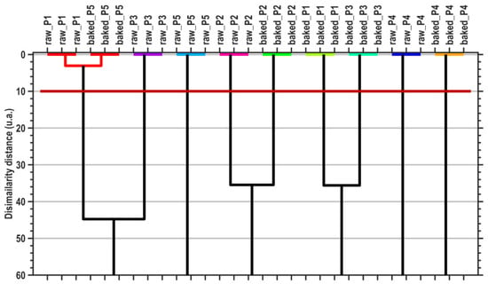 Dendrogram graphical representation of hierarchical cluster analysis (HCA). The horizontal dark-red line denotes the dissimilarity threshold distance that generates the proper cluster number, generated by the MANOVA (p = 0.05) multivariate method.