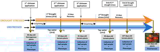 Workflow diagram of drought stress treatment, chitosan application and sampling. Priming involves the treatment of plants with chitosan or control solution prior to start of drought stress.