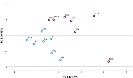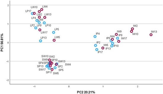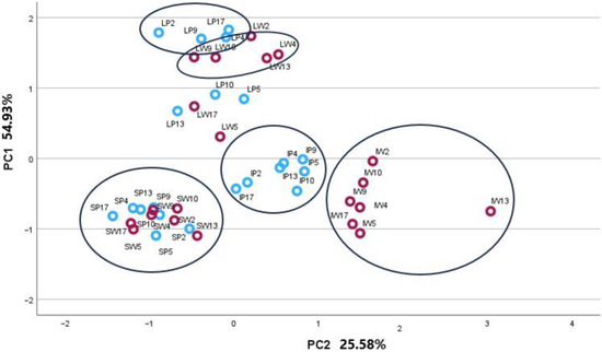 PCA-3 score plot model presenting phytochemical compound groups in plant organs (I−inflorescences; L−leaves; S−stems) of P (blue circles) and W (red circles) Achillea millefolium morphotypes.