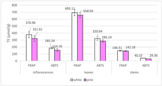 Antioxidant activity mean Trolox equivalent (TE) values (µmol/g, DW) of inflorescences, leaves and stems of white and pink A. millefolium morphotypes.