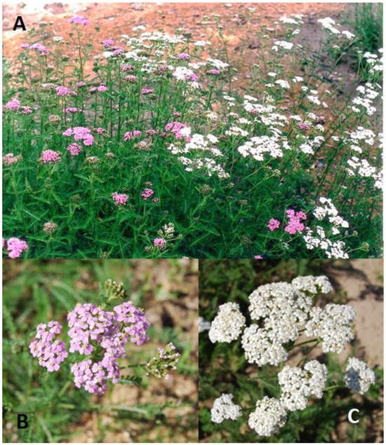 Two wild morphotypes of Achillea millefolium ((A)—mixed stands; (B)—pink morphotype; (C)—white morphotype). Photo by authors.