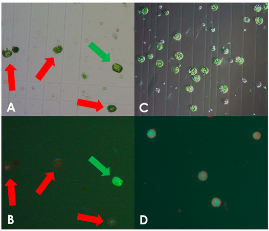 Optimization of protoplast isolation. Protoplast isolated using the non-optimized protocol for S. tuberosum showing viable and burst cells as indicated by green and red arrows, respectively, under white light (A) and fluorescein staining (B). Only very few viable S. bulbocastanum protoplasts could be isolated when using the protocol for S. tuberosum. Protoplast isolated after protocol adjustment, showing viable, spherical shapes with no debris present, under white light (C) and fluorescein staining (D).