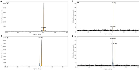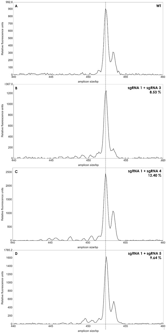 IDAA profiles of edited protoplast cells. The amplicon size of 453 bp of the wild type (WT) was used as reference (A). Small peaks from 440 to 452 bp’s indicated deletions between 1 to 13 bp in batches of protoplasts. The peak areas of the deletions for each sgRNA combination (B–D) was calculated as percentages, as described in [12]. Dashed line indicates amplicon size in WT plants.
