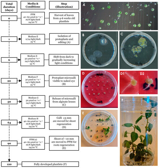 Timeline of the regeneration protocol. Isolated protoplasts prior to transformation (A). Day 20 post protoplast isolation (ppi) showing protoplast embedded in alginate lenses (B). Day 50 ppi, prior to release from the alginate lenses (C). Day 64 ppi, hardened calli showing initiation of early plant growth (D). Calli with premature root emergence (D1,D2). Day 90 ppi, presence of shoots of ~10–20 mm length (E). Day ~120 ppi, fully regenerated plants grown in propagating medium (F).