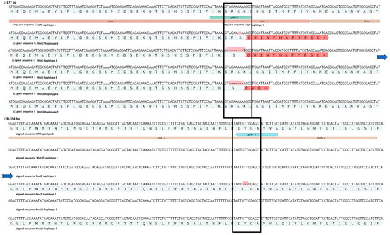 Sequencing of ten cloned amplicons from each mutant line confirmed the IDAA results (Figure 6). We identified one allele with a 2 bp deletion of two adenines (A’s) localised 3 bp upstream of the PAM site of sgRNA1 in all ten clones of mutant 17. This monoallelic homozygous mutation leads to a frameshift followed by a premature stop codon in the beginning of exon 2 (Supplementary Materials S3). Therefore, this plant is predicted to contain a full loss-of-function mutation in the gene of interest. Mutant 18 has a deletion of a −7 bp (AGAAAAA) sequence 4 bp upstream of the PAM site of sgRNA1 on one allele. The other allele appeared to be WT, and the amplicon genotype is therefore in agreement with the IDAA analysis, which suggests that the plant is heterozygous. This mutation also leads to a frameshift followed by a premature stop codon at the end of exon 1. Biallelic mutant 2 had a deletion of eight bp (AGAAAAAA) in 1 allele, 4 bp upstream of the sgRNA1 PAM site. This mutation also leads to a frameshift and a premature stop codon in the beginning of exon 2. However, the second allele of mutant plant 2 contained an in-frame deletion of 3 bp (GTT), which leads to a deletion of a single amino acid, a valine. The deletion in this allele is situated 4 bp in upstream of the sgRNA3 PAM site (Figure 6).