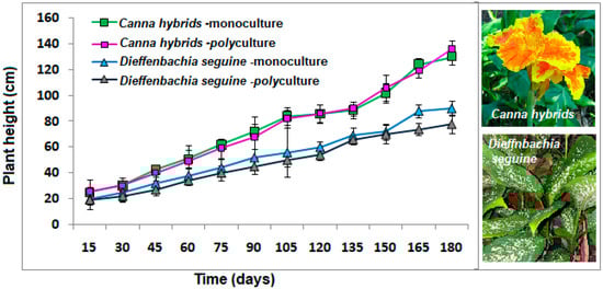 Growth of the Canna h. (Figure 1) in the 180 days of the study tended to be similar in monoculture or polyculture conditions (p = 0.311) (without possible interspecific competition among species in the same space in polyculture conditions) but higher (125–130 cm) than Dieffenbachia s. (65–80 cm), which is derivative of the nature of the species since the former can reach up to 2.2 m in height and grows well in waterlogged conditions with frequent exposure to sun sites []. In the case of Dieffenbachia s., it is not a common wetland species; such plants grow best under partial shade of trees (1–2 m) [], but its adaptation was shown, although slower (Figure 1).
