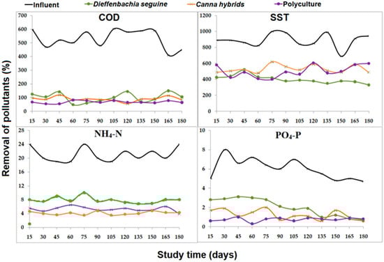 For NH4-N and PO4-P, the range of concentrations in the influent were 20–25 mg/L and 5–8 mg/L, respectively. At the effluent, they were 4–10 mg/L and 0–3 mg/L, respectively (Figure 2), except for ammonia (average 80.8 ± 8.7 mg/L) and phosphate (average 86.7 ± 10.6 mg/L), the pollutant measured did not show statistically (p > 0.05) different removal rate between polycultures and monocultures with Canna hybrids (75–80%; p > 0.05), compared with the removal in monoculture CWs of Dieffenbachia seguine (63–68%; p < 0.05). Luo et al. [] indicated that plant communities with various growth forms reduced the intensity of interspecific competition, increased functional diversity, and greatly enhanced the ability to consume nitrogen and phosphorous compounds.