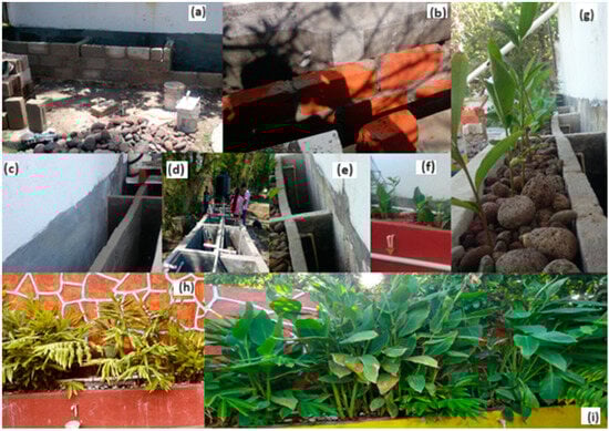Construction of domiciliary treatment wetland for wastewater at the household level. (a) CWs cell construction, (b) red blocks used in CWs, (c) CWs cell structures, (d,e) installation of the pipeline, (f,g) planted species, (h) systems after three months of construction, (i) systems after six months of construction.
