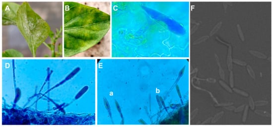 The morphological identification of the phytopathogen causing powdery mildew on jalapeño plants coincided with the characteristics described for the species L. taurica. Whitish powdery mildew, consisting of hyaline, septate mycelium and conidiophores (Figure 1A), was observed on the underside of the leaves and on the upper side of the leaves there were yellowish chlorotic spots (Figure 1B). Conidiophores emerging from leaf stomata (Figure 1C) were simple, with two to three branches (Figure 1D) from which conidia of lanceolate (Figure 1E(a),F) and cylindrical (Figure 1E(b),F) types were produced. These characteristics are similar to those reported by Salmon [22], Mosquera et al. [23] and Glawe [24]. The conidia presented the following dimensions: 70 µm long × 18 µm wide for the lanceolate form and 65 µm long × 18 µm wide for the cylindrical form, similar to measures previously reported for L. taurica [25,26]. In the present study, no sexual spores (cleistothecia) were observed on infected leaves, as also reported by Jones et al. [27] and Abdel-Azeem and Abdel-Moneim [28] who did not observe these structures.