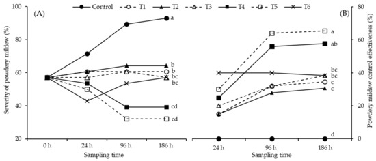 Application of different chitosan treatments (T1 = 0.0125% chitosan, T2 = 0.0025% chitosan, T3 = 0.05% chitosan, T4 = 0.1% chitosan, T5 = 0.2% chitosan, T6 = tebuconazole 25% (1.8 mL/L water), and T7 = control (water)), for the control of Leveillula taurica on Mixteco F1 jalapeño pepper. Different letters indicate differences between treatments (Tukey p ≤ 0.05). (A) Percentage severity of L. taurica and (B) percentage control efficacy on L. taurica powdery mildew.