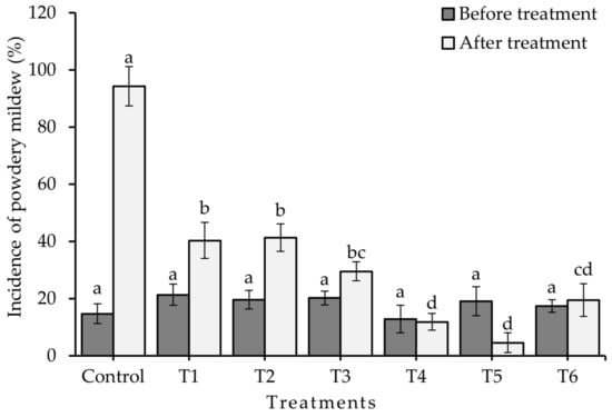Reduction in the incidence of powdery mildew disease in the Mixteco F1 jalapeño pepper after the application of different concentrations of chitosan. ■ = incidence before treatment, □ = incidence after treatment. T1 = 0.0125% chitosan, T2 = 0.0025% chitosan, T3 = 0.05% chitosan, T4 = 0.1% chitosan, T5 = 0.2% chitosan, T6 = tebuconazole 25% (1.8 mL/L water), and T7 = control (water). Different letters indicate difference between treatments (Duncan p ≤ 0.05). n = 5 ± standard error.