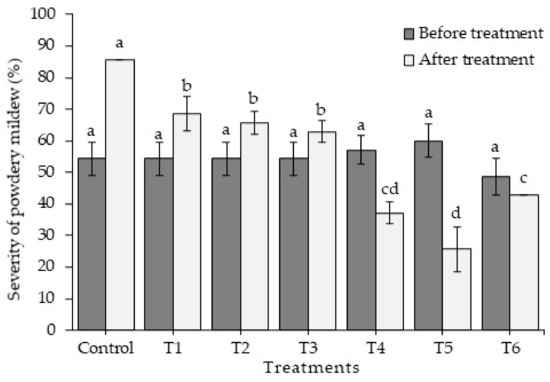 Reduction in the severity of powdery mildew disease in the Mixteco F1 jalapeño pepper after the application of different concentrations of chitosan. ■ = severity before treatment, □ = severity after treatment. T1 = 0.0125% chitosan, T2 = 0.0025% chitosan, T3 = 0.05% chitosan, T4 = 0.1% chitosan, T5 = 0.2% chitosan, T6 = tebuconazole 25% (1.8 mL/L water), and T7 = control (water). Different letters indicate difference between treatments (Duncan p ≤ 0.05). n = 5 ± standard error.