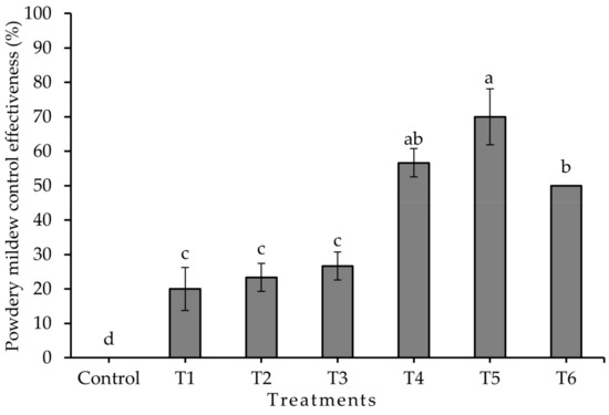 According to Arici and ÖZkaya [31], the control of powdery mildew by applying fluopyram + tebuconazole to canyon F1 chili bell pepper crops in greenhouse conditions obtained 87.00 ± 0.39% control efficacy and 3.30 ± 0.13% reduction of severity. Similarly, the application of Timorex Gold® (tea tree oil) obtained 6.00 ± 0.14% reduction of severity and 80.0 ± 0.45% control efficacy, values that were higher than those recorded in the present study in treatment T6, which had 50.00 ± 0.00% control efficacy and 42.86 ± 0.00% reduction of severity. In the present study, the T5 treatment registered the highest control efficacy (70.00 ± 8.16%) compared to the treatments with fluopyram + tebuconazole and Timorex Gold®, demonstrating that chitosan has better control efficacy on powdery mildew in comparison with synthetic fungicides and organic extracts.