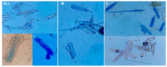 Effect of chitosan application on Leveillula taurica. (A) 0.2% chitosan application: (a) spores and mycelium with dry and deformed appearance, (b) spore with broken wall, and (c) deformed spore; (B) tebuconazole effect similar to that of chitosan; and (C) control treatment: spores with normal appearance.