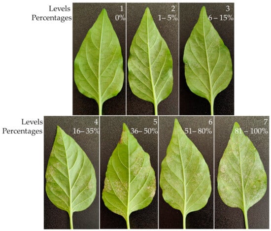 Jalapeño pepper leaves that presented visual symptoms of the disease were collected and homogenized, with the help of a 7-level visual scale, to a level of 4, corresponding to a severity of 16 to 35% (Figure 8). These leaves were placed individually, with the petiole wrapped in moist cotton inside plastic containers (Clear Food Container; 4.25″ long × 4.25″ wide × 2.5″ deep) to avoid dehydration. For the treatments, chitosan extracted from shrimp shells with characteristics of 100% deacetylation and a viscosimetric molecular weight (Mv) of 457,000 g-mol−1, belonging to the Microbiology Laboratory of the UAAAN, was used. This chitosan was diluted in sterile water acidified with acetic acid at pH 5.5 to obtain the required percentages. A completely randomized design with the following seven treatments was used: T1 = 0.0125% chitosan, T2 = 0.0025% chitosan, T3 = 0.05% chitosan, T4 = 0.1% chitosan, T5 = 0.2% chitosan, T6 = tebuconazole 25% (1.8 mL/L water), and T7 = control (water), with four replicates, which were kept in the laboratory at a temperature of 28 °C and a photoperiod of 12:12 light: dark until the end of the experiment. The concentrations of chitosan in the present study ranged from 0.0125 to 0.2%, because in a previous study the application of 0.013% chitosan decreased the incidence of Podosphaera pannosa by 31.2% (February–April) and 19.3% (May–July), and applications of 0.025 to 0.2% reduced the development of powdery mildew in rose by 43.5 to 85.4% [34].