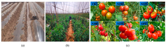 Planting and growth of open-field tomato. (a), tomato transplanting, (b), tomato flowering stage, (c), the full fruit period of different treatments. CK refers to 0 fertilization; N150, N225, N300, and N375 refer to 150, 225, 300, and 375 kg N ha−1, respectively; and OPT refers to optimal fertilization (controlled-release nitrogen fertilization, 240 kg N ha−1). The same applies below.