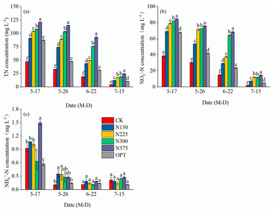 Comparison of leached concentrations of TN, NO3−-N, and NH4+-N under different treatments. (a), total nitrogen (TN) concentration (mg L−1), (b), nitrate nitrogen (NO3−-N) concentration (mg L−1), (c), ammonia nitrogen (NH4+-N) concentration (mg L−1). The lowercase letter(s) over the bars indicate significant differences according to LSD multiple range tests at p < 0.05, and the error bars represent standard deviation or standard error (n = 3).