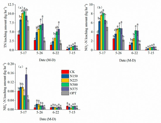 The concentrations of various forms of nitrogen (TN, NO3−-N and, NH4+-N) in leached water increased with increasing nitrogen application rates but decreased with increased irrigation times (Figure 2a–c). For each treatment, the highest leached TN, NO3−-N, and NH4+-N concentrations occurred after the first irrigation (17 May); the concentrations were 47.19–120.77 mg L−1, 38.51–84.63 mg L−1, and 0.57–4.48 mg L−1, respectively. The lowest leached nitrogen concentrations were observed after the final irrigation (15 July); the concentrations were 4.14–24.31 mg L−1, 2.22–14.54 mg L−1, and 0.13–0.27 mg L−1 for TN, NO3−-N and, NH4+-N, respectively. The leached concentration of NO3−-N was significantly higher than that of NH4+-N, and the TN and NO3−-N concentrations were significantly different after different irrigation periods (p < 0.05). Leached nitrogen was highest for N375 for different treatments, CK and OPT were the lowest in different periods, and OPT reduced the concentrations of different forms of nitrogen in the leached water.