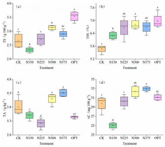 Comparison of tomato quality under different treatments. (a), total sugar (TS) content (g 100 g−1), (b), total soluble solids (TSS) content (%), (c), titratable acid (TA) content (g kg−1), (d), vitamin C (vC) content (mg 100 g−1). The lowercase letter(s) over the bars indicate significant differences according to LSD multiple range tests at p < 0.05, and the error bars represent standard deviation or standard error (n = 3). TS, TSS, TA, and vC represent total sugar (g 100 g−1), total soluble solids (%), titratable acid (g kg−1), and vitamin C (mg 100 g−1) in the tomato fruits.