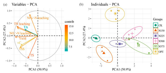 PCA (Figure 5a) showed the overall impacts of diverse nitrogen application rates on nitrogen leaching and plant characteristics. The PCA (Figure 5a,b) showed that 78.3% of variability was explained by component 1 (50.9%) and component 2 (27.4%). TN leaching and NO3−-N leaching were highly correlated with TA, which were the main factors promoting TA formation. NH4+-N leaching was highly negatively correlated with TS. PCA also revealed significant differences between OPT and other treatment methods (Figure 5b).