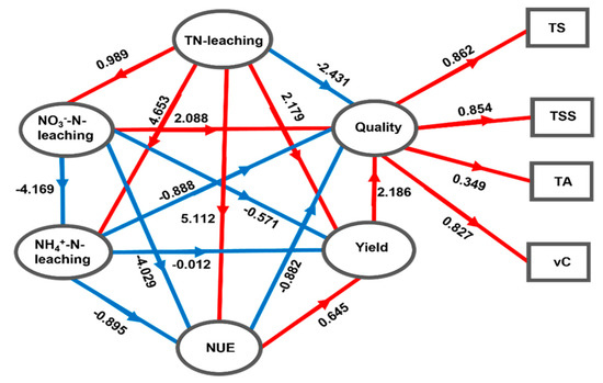 The path analysis was conducted using partial least squares path modeling (PLS-PM) to examine the causal relationships and strengths among soil nitrogen leaching, nitrogen utilization efficiency, tomato yield, and quality. Figure 6 reveals that both NO3−-N, and NH4+-N leaching have negative impacts on NUE and tomato yield, with coefficients of −4.029, −0.571, −0.895, and −0.012, respectively. Conversely, there is a positive influence observed between nitrogen utilization efficiency, yield, and quality. Notably, nitrogen utilization efficiency significantly contributes, with a coefficient of 0.645, towards the overall yield.