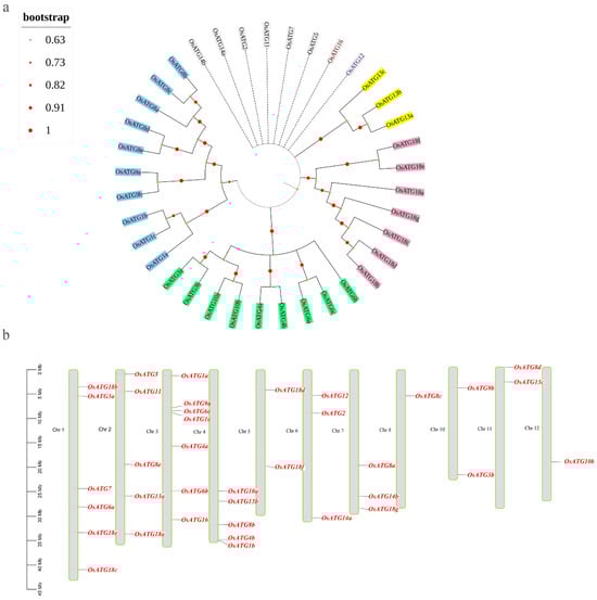 Phylogenetic and chromosomal localization analysis of OsATGs. (a) Phylogenetic analysis of OsATGs. The bootstrap values indicate the confidence of the branching. Clusters I–IV are represented by yellow, purple, green, and blue colors, respectively, while gray indicates individual groups. (b) Chromosomal localization analysis of OsATGs. The scale represents the distance on the chromosome, and the number of chromosomes is shown on the left side of each chromosome. Chromosomes are represented by gray boxes with green borders, while OsATG genes are displayed in red font. Rice has a total of 12 chromosomes, and OsATG genes are not distributed on Chr 9; hence, it is not shown here.