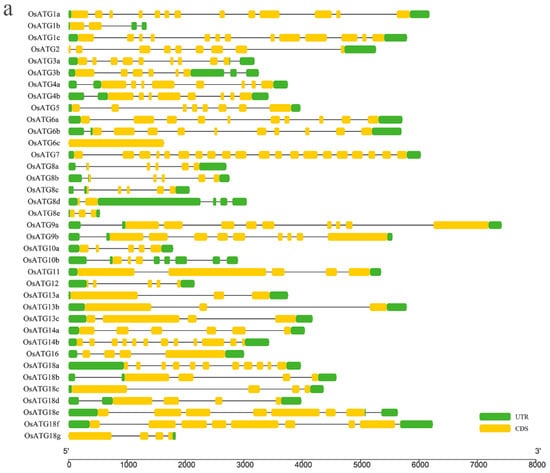 In this study, we identified 37 OsATGs in rice and conducted a series of bioinformatic analyses. Our analyses revealed significant variations in the physicochemical properties of different OsATGs (Table 1) and variations in the number of exons (Figure 2a). However, the distribution of functional domains and conserved motifs exhibited similarities. For example, all OsATG8 genes contained the “ubl-ATG8” domain and motif 1, while all OsATG18 genes contained the “WD40” domain and motif 3 (Figure 2b and Figure 3a). These analytical results show similarities to the analysis of ATG homologs in other species [11,30].