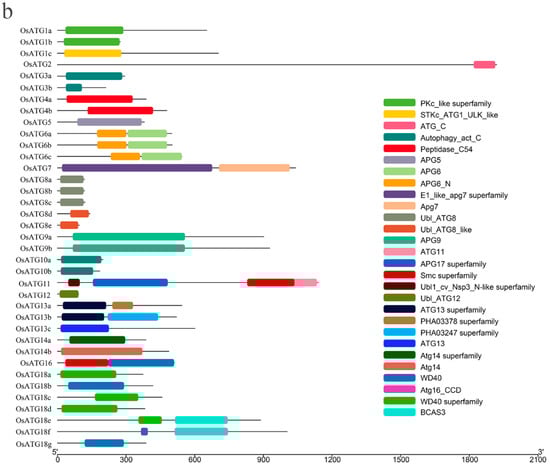 Gene structure and functional domain analysis of OsATGs. (a) Gene structure analysis of OsATG genes. The scale represents the gene length of OsATGs. The green box represents the untranslated region (UTR), the yellow box represents the coding sequence (CDS), and the unmarked regions represent introns. (b) Functional domain analysis of OsATG proteins. The scale represents the protein size of OsATGs, and the different colored boxes represent different functional domains.