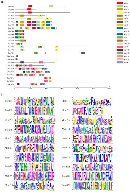 Motif analysis of OsATGs. (a) The distribution of 20 motifs in OsATGs. The scale represents the protein size of OsATGs, and the different colored boxes indicate the presence of different motifs. (b) The sequences of the 20 motifs in OsATGs. The height of each amino acid symbol is proportional to the conservation degree of the common sequence depicted by the 20 motifs. The shortest motif (motif 12) is only 21 amino acids and the longest motifs (motifs 1–5, 7, 8, 14, 19, and 20) are 50 amino acids. These sequence motifs are marked as created by MEME (motif-based sequence analysis tools).